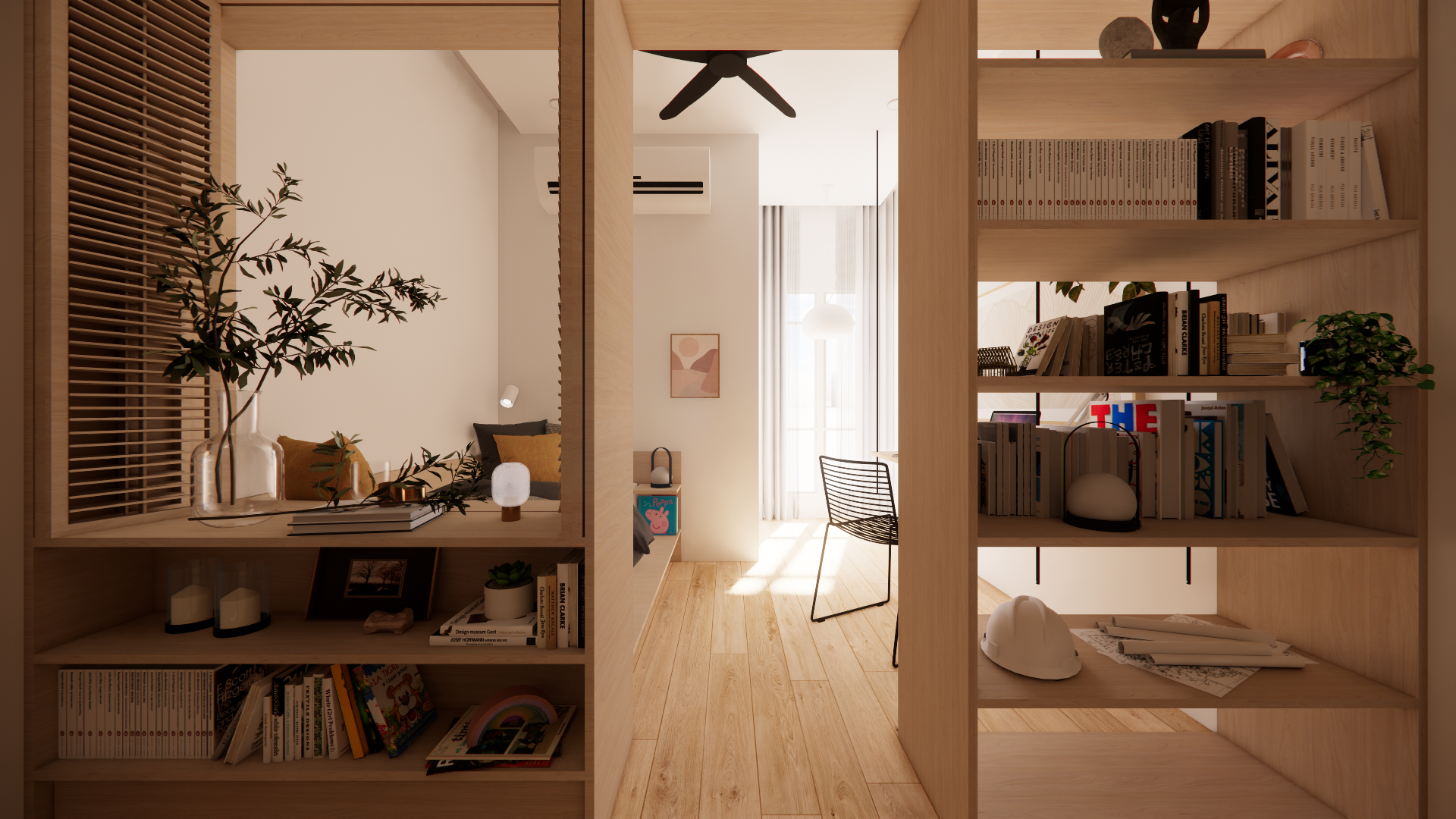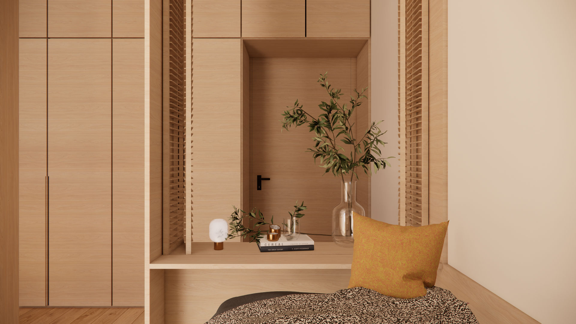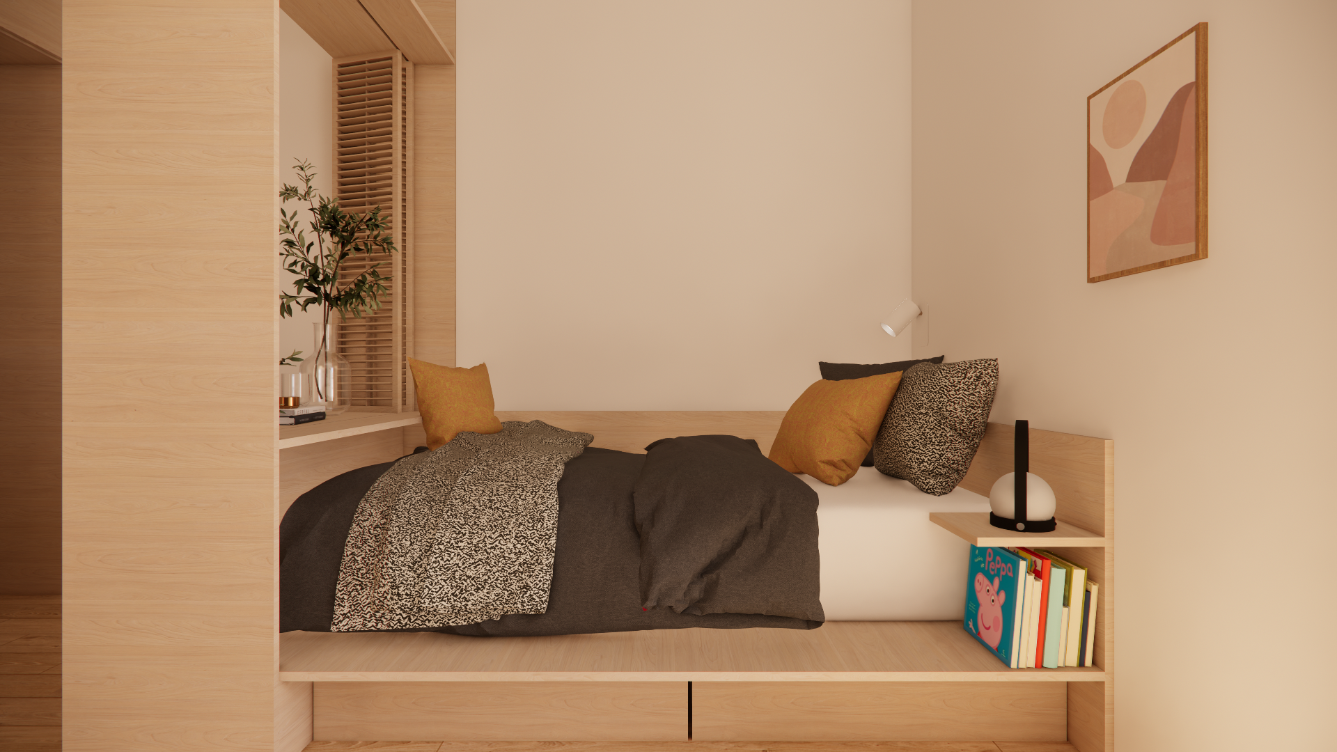 Spatial clarity guides the design. The room is shaped around three gentle zones - rest, play, and learning - defined through subtle thresholds rather than solid breaks. This soft zoning creates a flow that feels effortless, offering both openness and the comforting sense of being held.