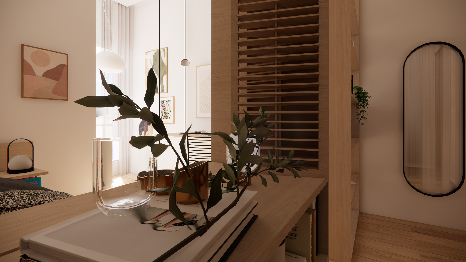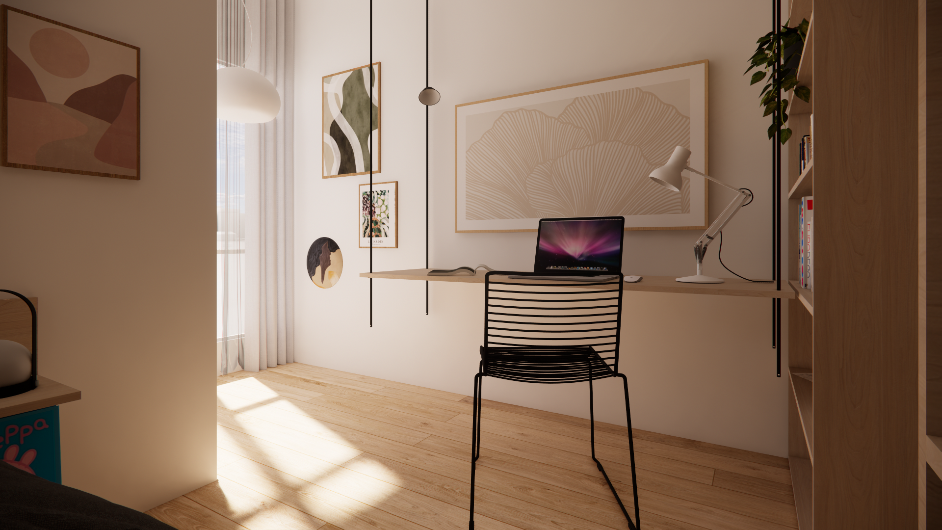 A soft, neutral palette sets the tone. Warm timbers blend effortlessly with porcelain-toned walls, creating a light-filled base that expands the room visually and offers a sense of calm. Within this restrained foundation, expressive details slip in - muted linens, warm brass accents, the sculptural presence of a floating desk suspended from ceiling-mounted steel rods. Light, poised, and quietly playful, it brings a touch of wonder without adding visual weight.